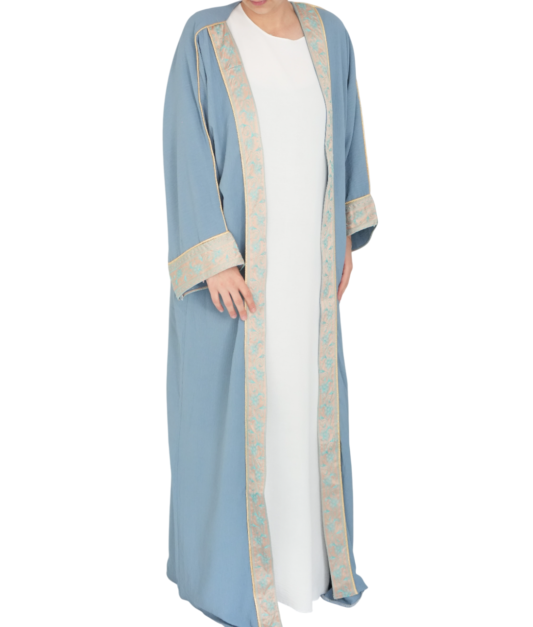 Blauwe bisht, afgewerkt met gouden handgemaakt borduurwerk.