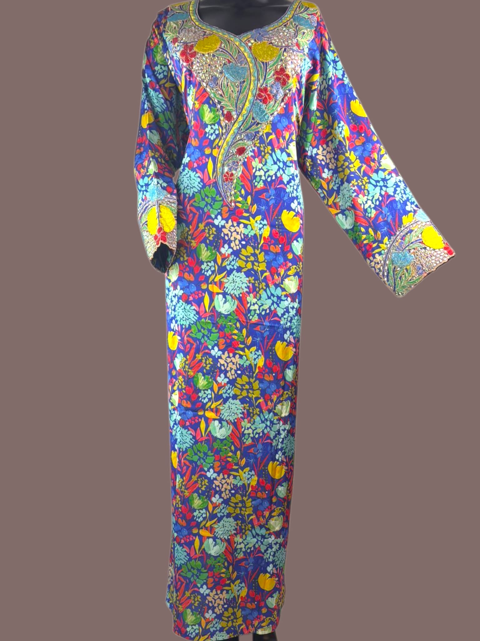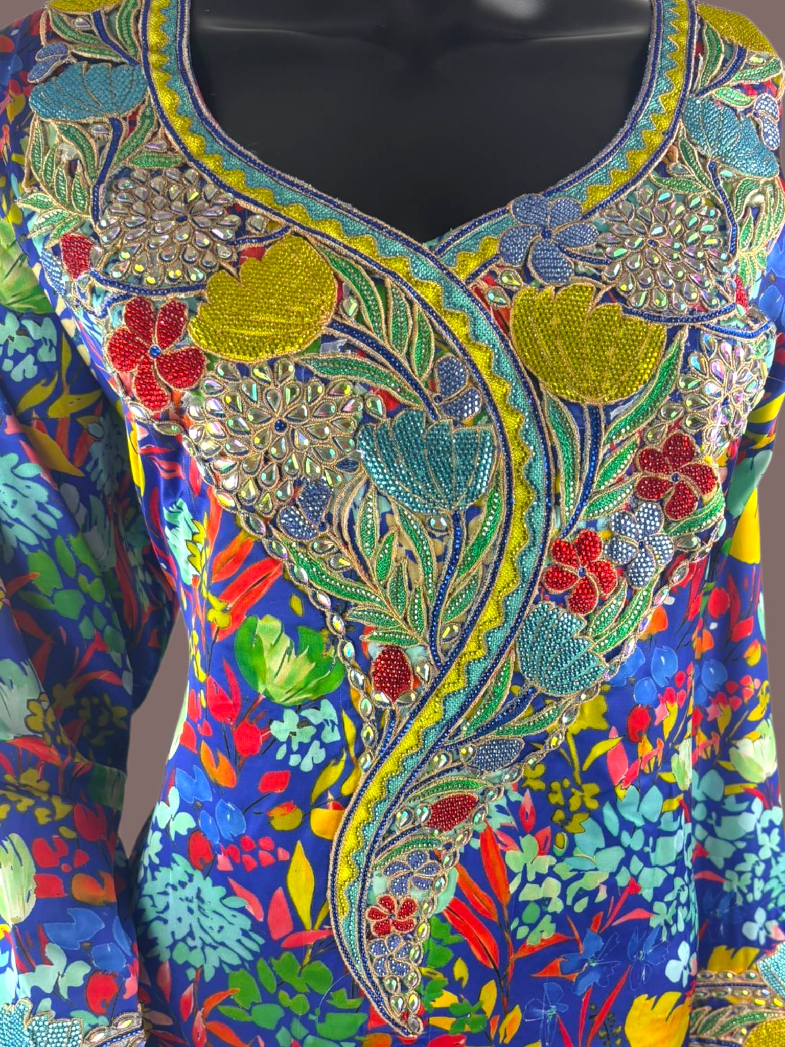 Blauwe jalabiya met grote applicatie afgewerkt met strass.