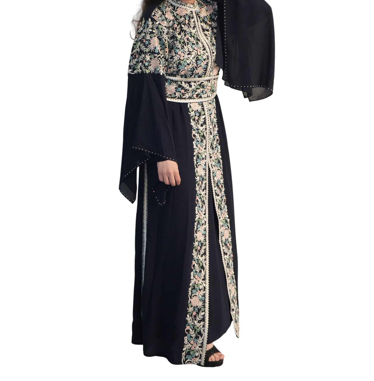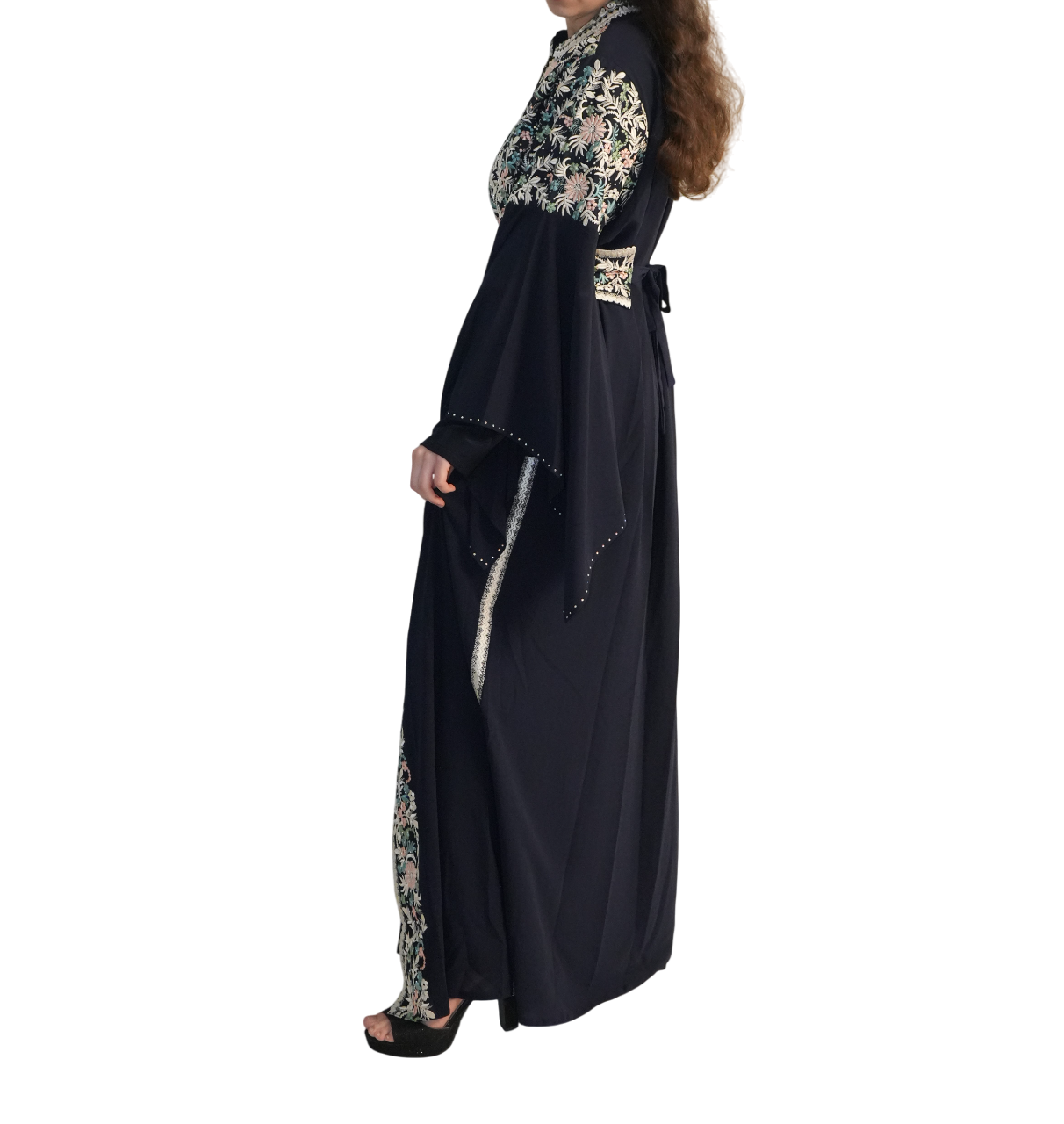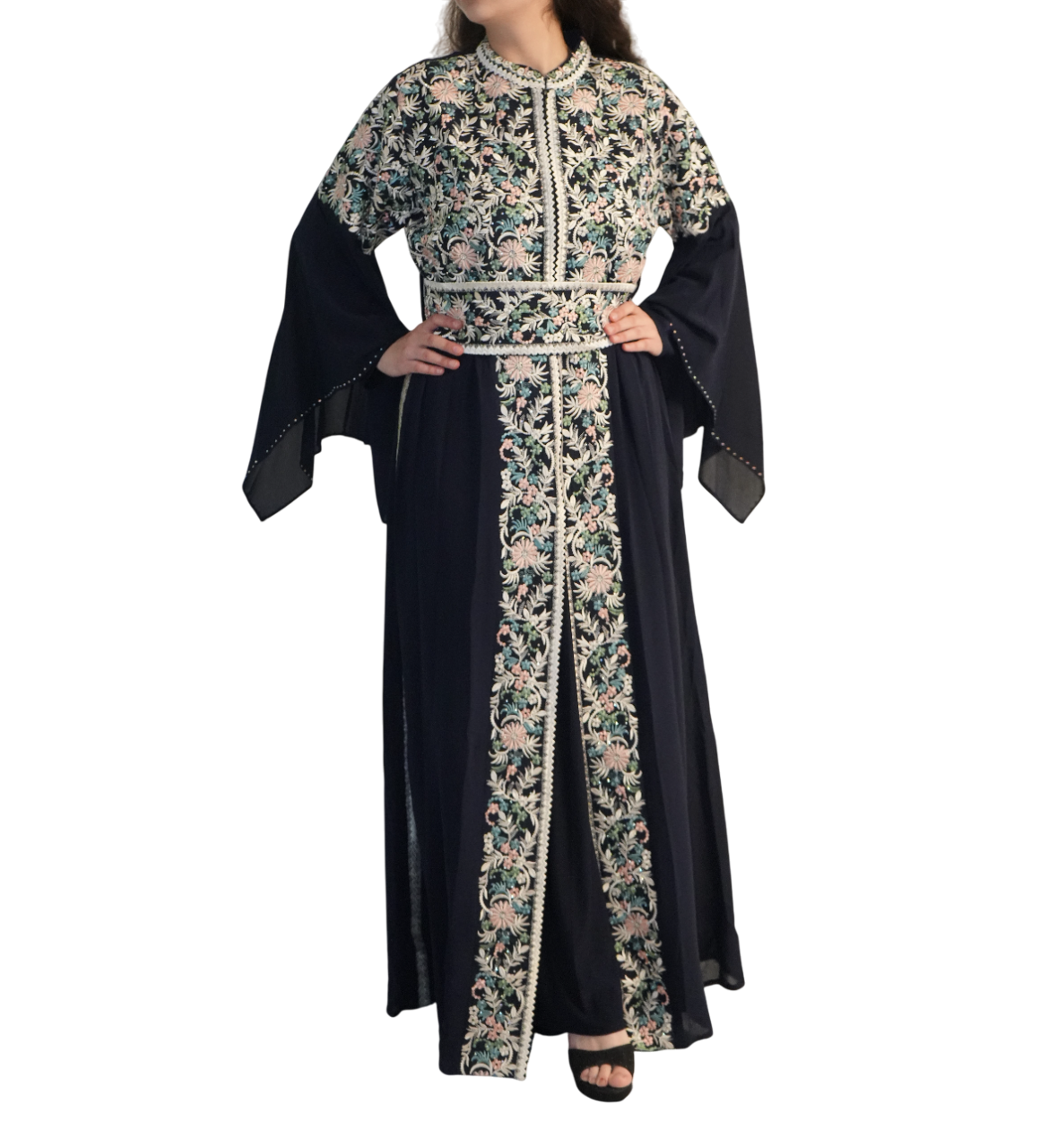 De bisht zelf is volledig met de hand afgewerkt met prachtig borduurwerk.