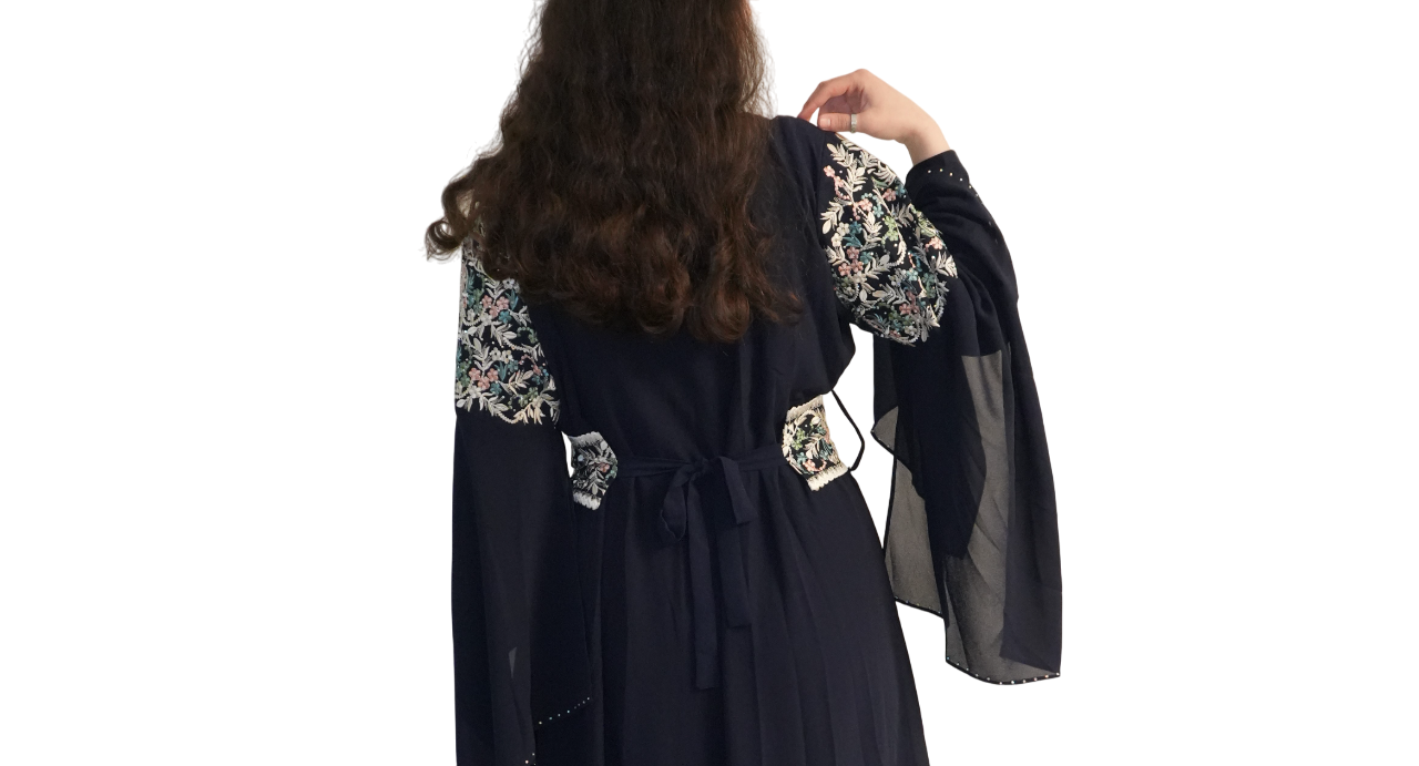 Daaroverheen zit een blauwe bisht met wijduitlopende mouwen. De mouwen zijn aan het einde afgewerkt met strass.