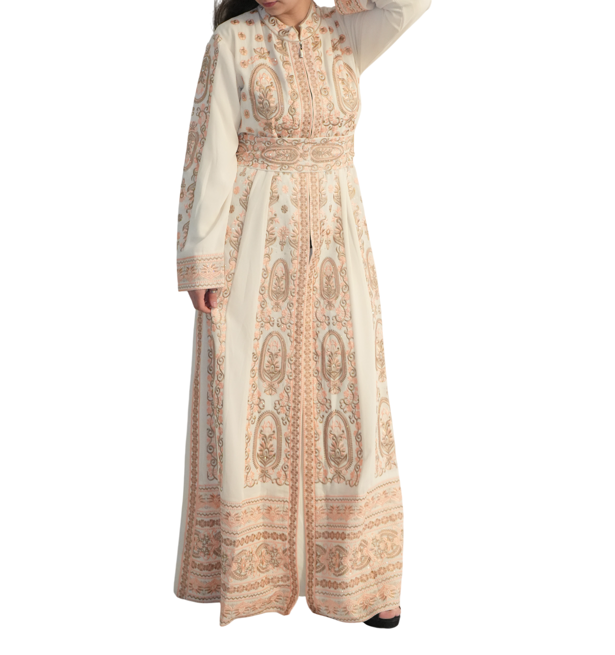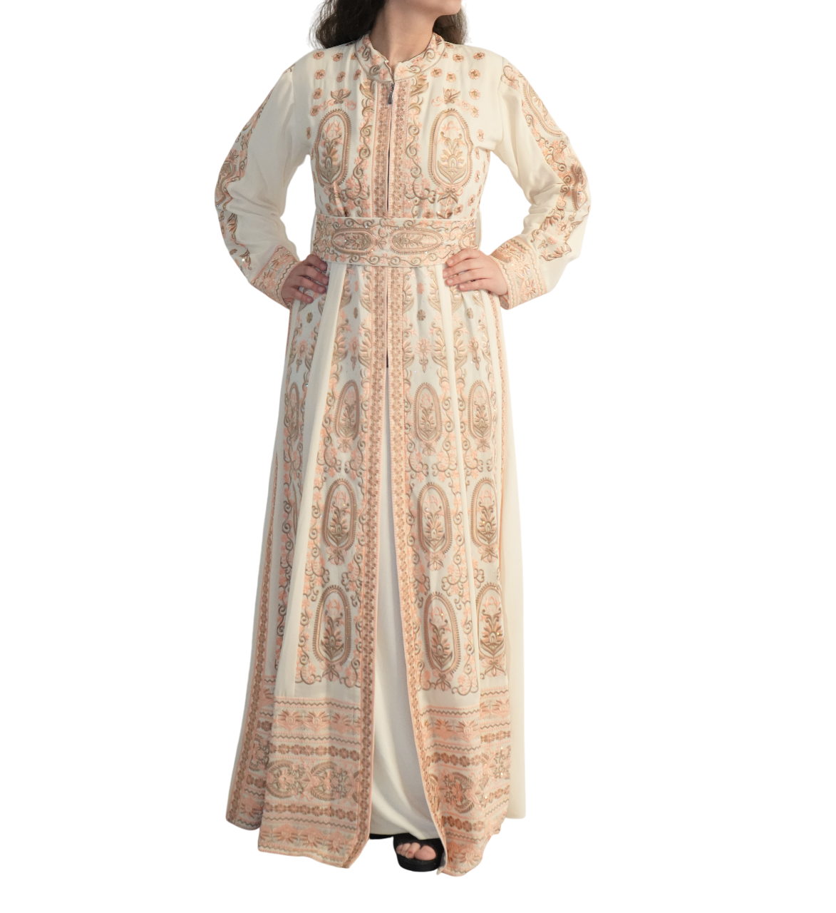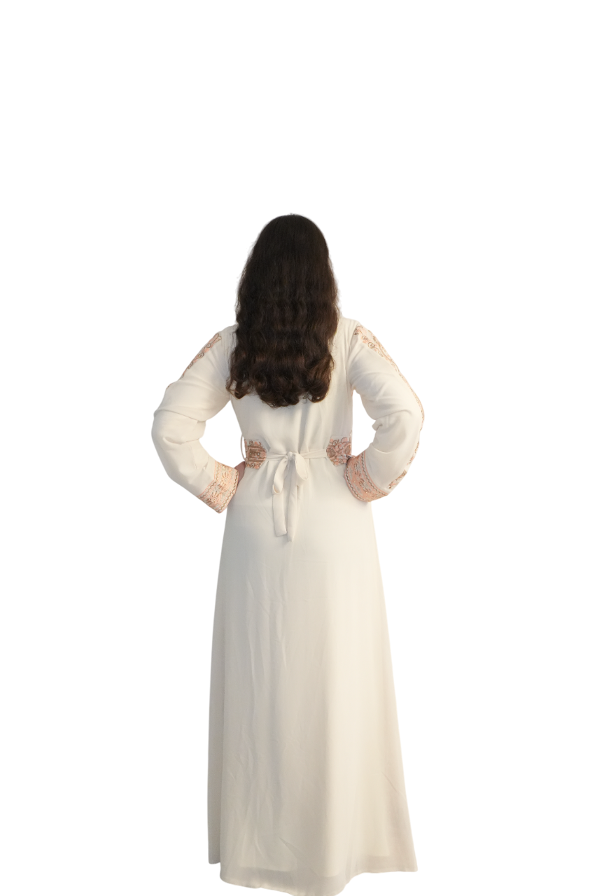 Deze set bestaat uit een cremekleurige onderjurk met daaroverheen een bisht afgewerkt met roze borduurwerk.