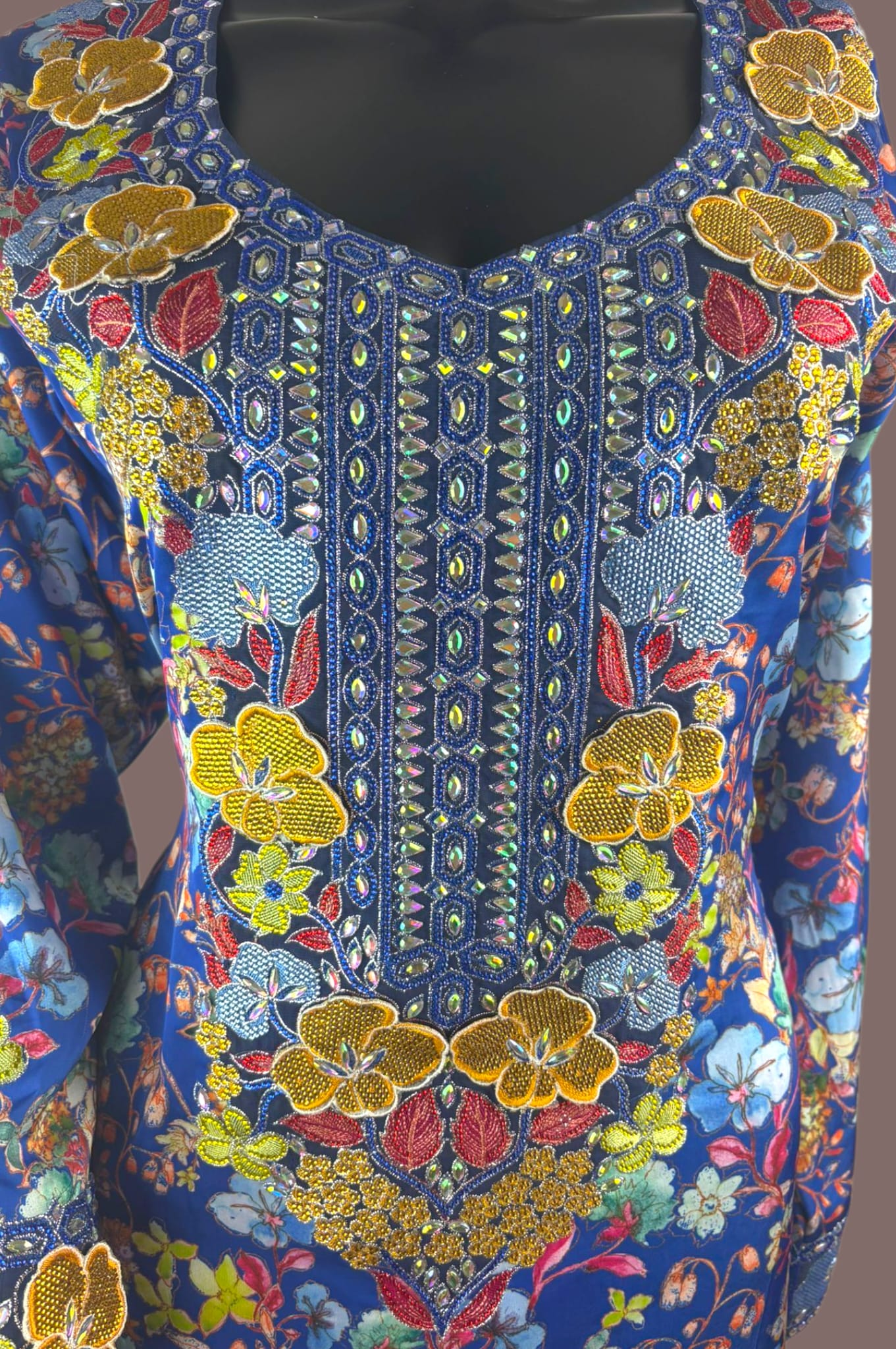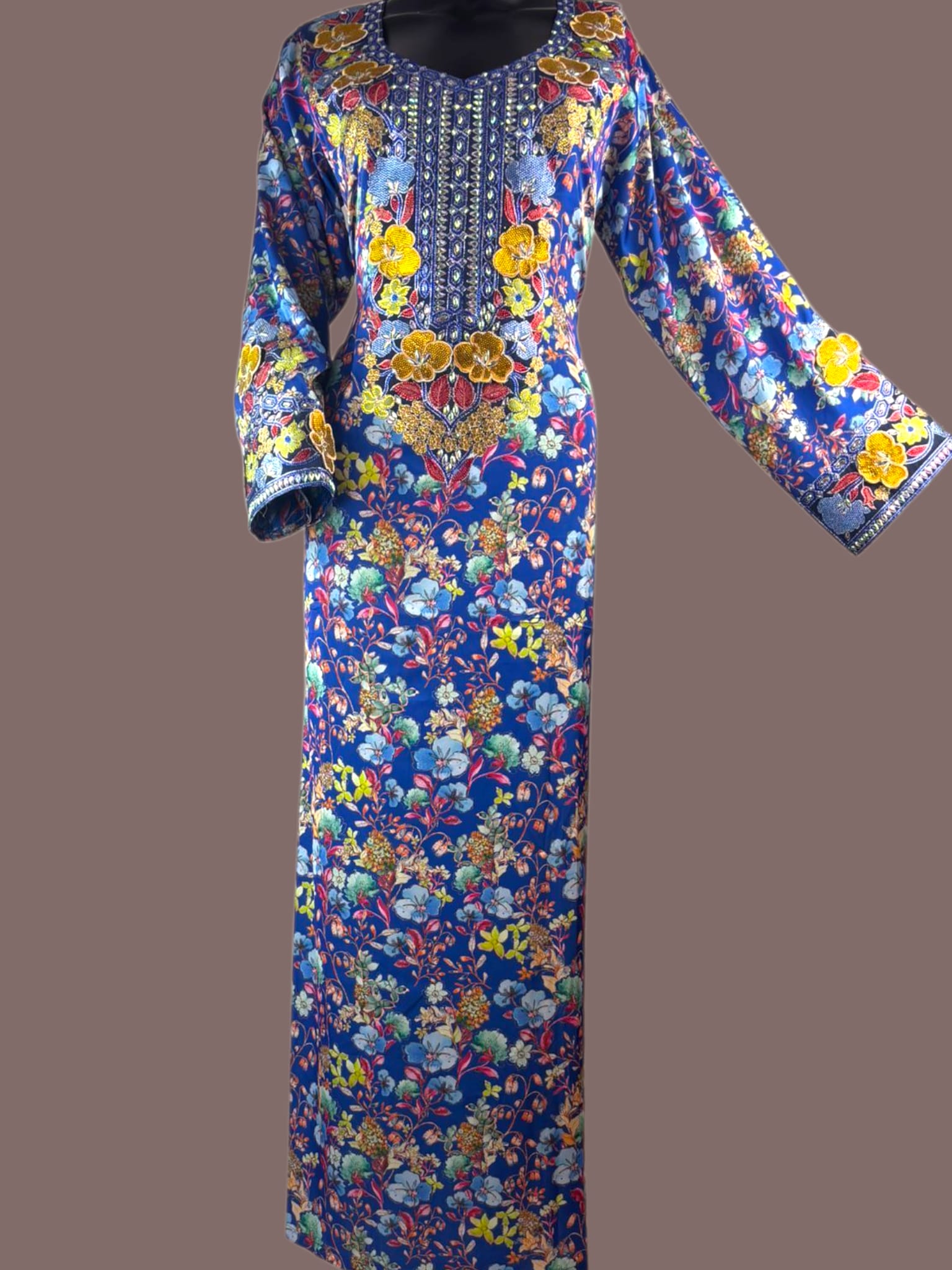 Donkerblauwe jalabiya met grote applicatie op de borst en mouwen.