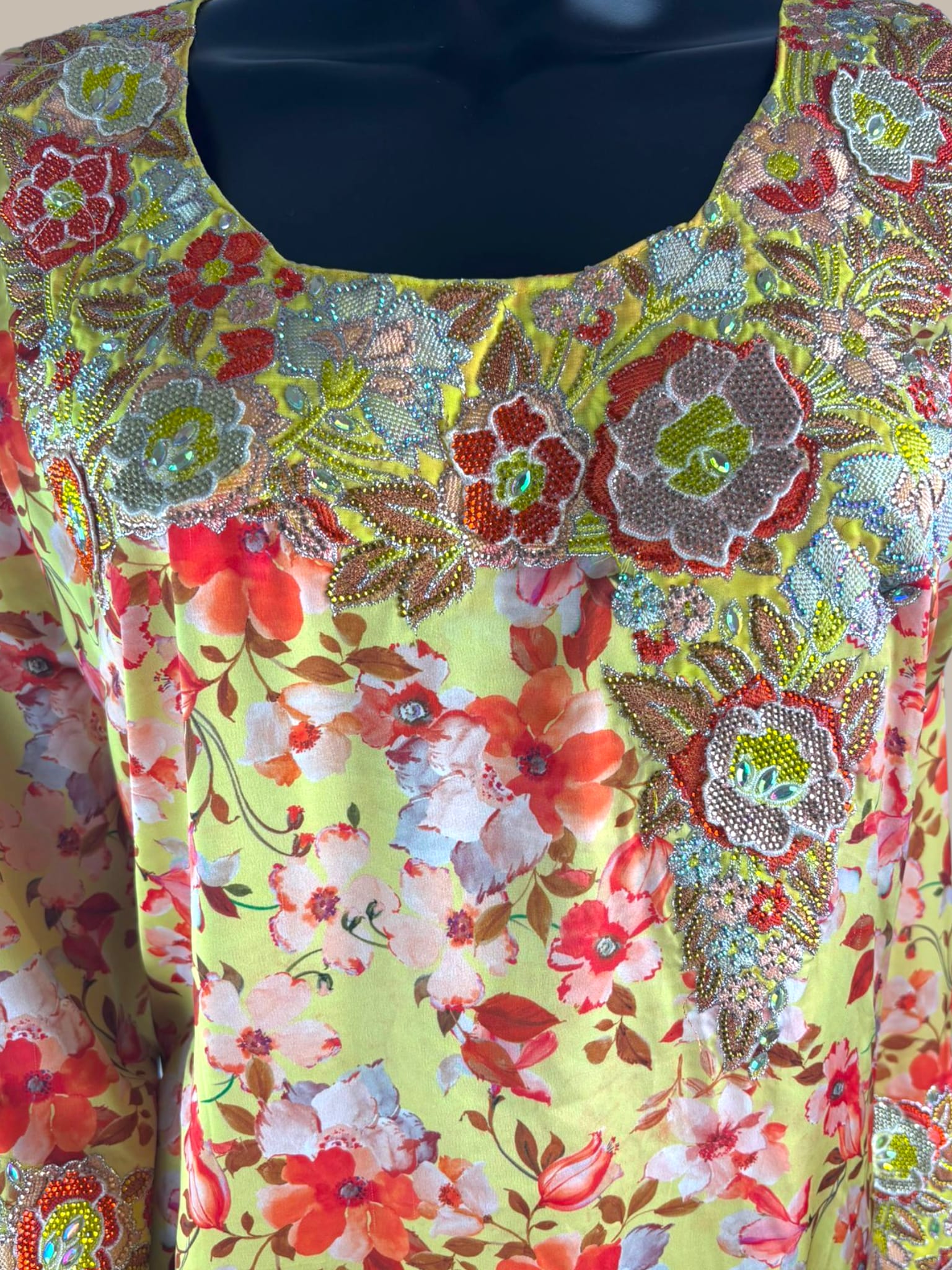 Gele jalabiya met 3d applicatie op de borst en mouwen.