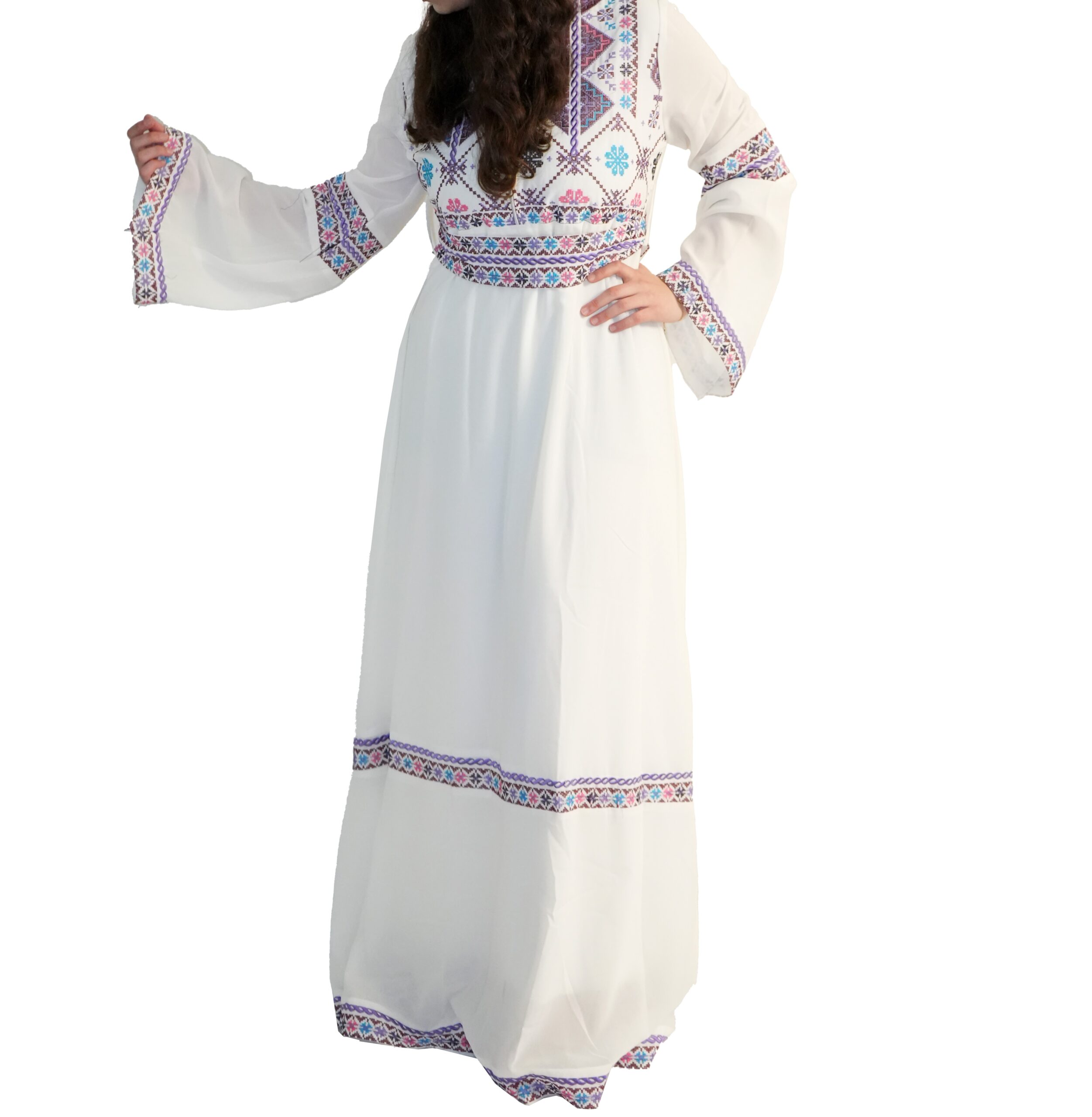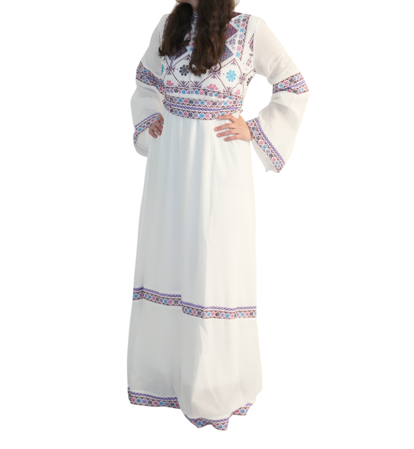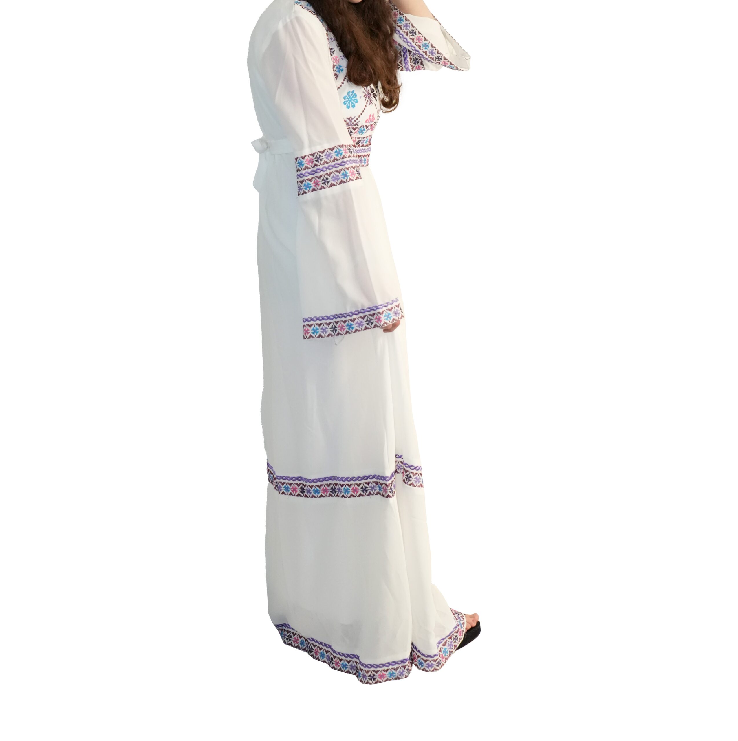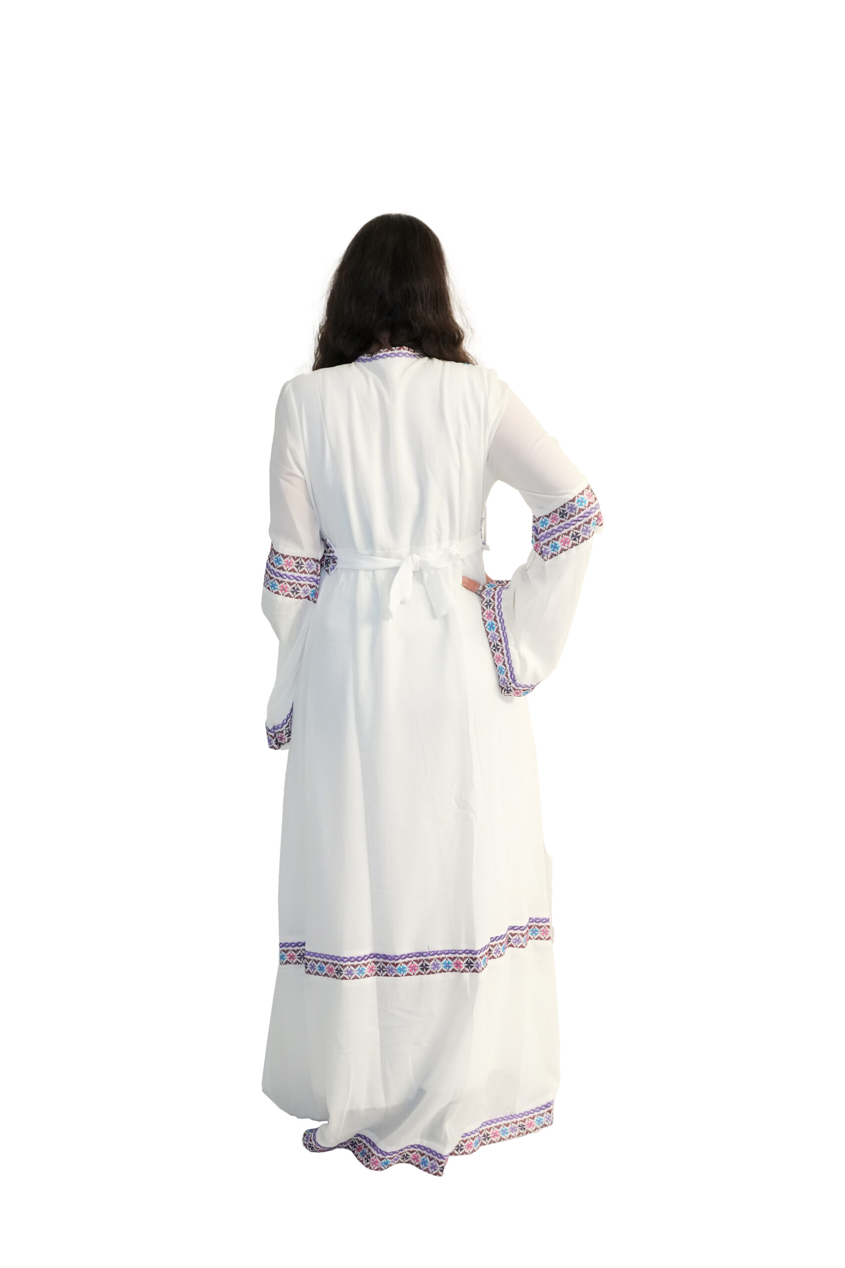 Witte jurk met handgemaakt borduurwerk op de borst, mouwen en rok.