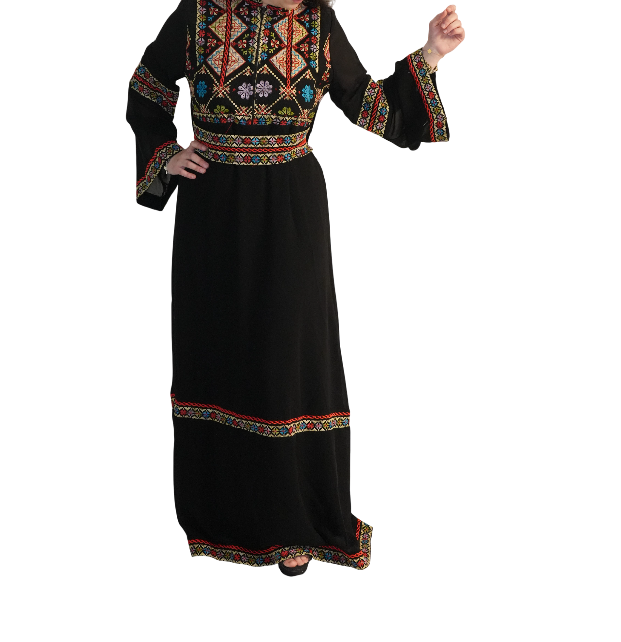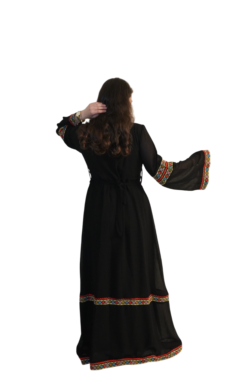 Zwarte jurk met handgemaakt borduurwerk op de borst, mouwen en rok.
